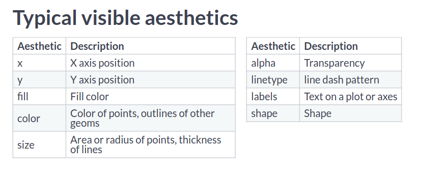 - For eg. In scatter plots, you need (x,y) but also can pass aesthetic mappings such as color, alpha, size, shape and so on.
