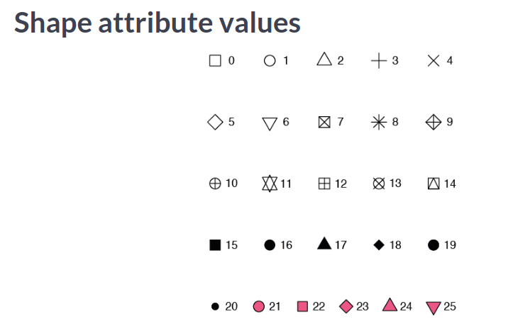 In cases you want to have properties of lines or points with something from the data itself, you can call aes() inside geom functions.geom_point(aes = col_1)NOTE: label and shape are used only with categorical variables.