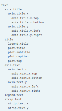 - Theme function contains all these elements and can be changed. But we don’t need to change all the elements: instead we use the hierarchy of data such as text, title and modify all elements within them as well.
